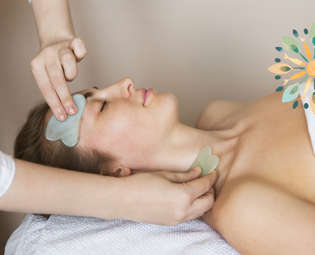 Gua Sha is a traditional Chinese healing method that scrapes the skin, using a smooth-edged tool to help release stagnation in the body and improve circulation. It is often used to help neck and shoulder pain or back pain. This scraping action can cause small, red, raised, dots to appear under the skin.
